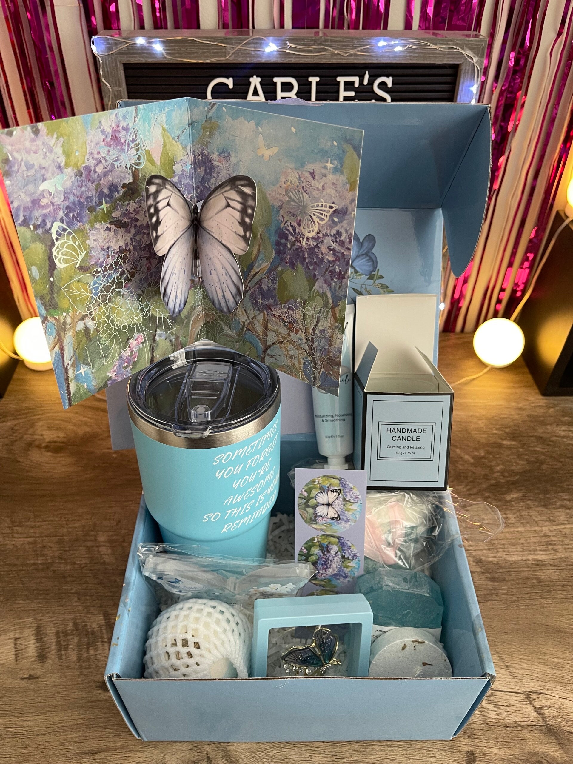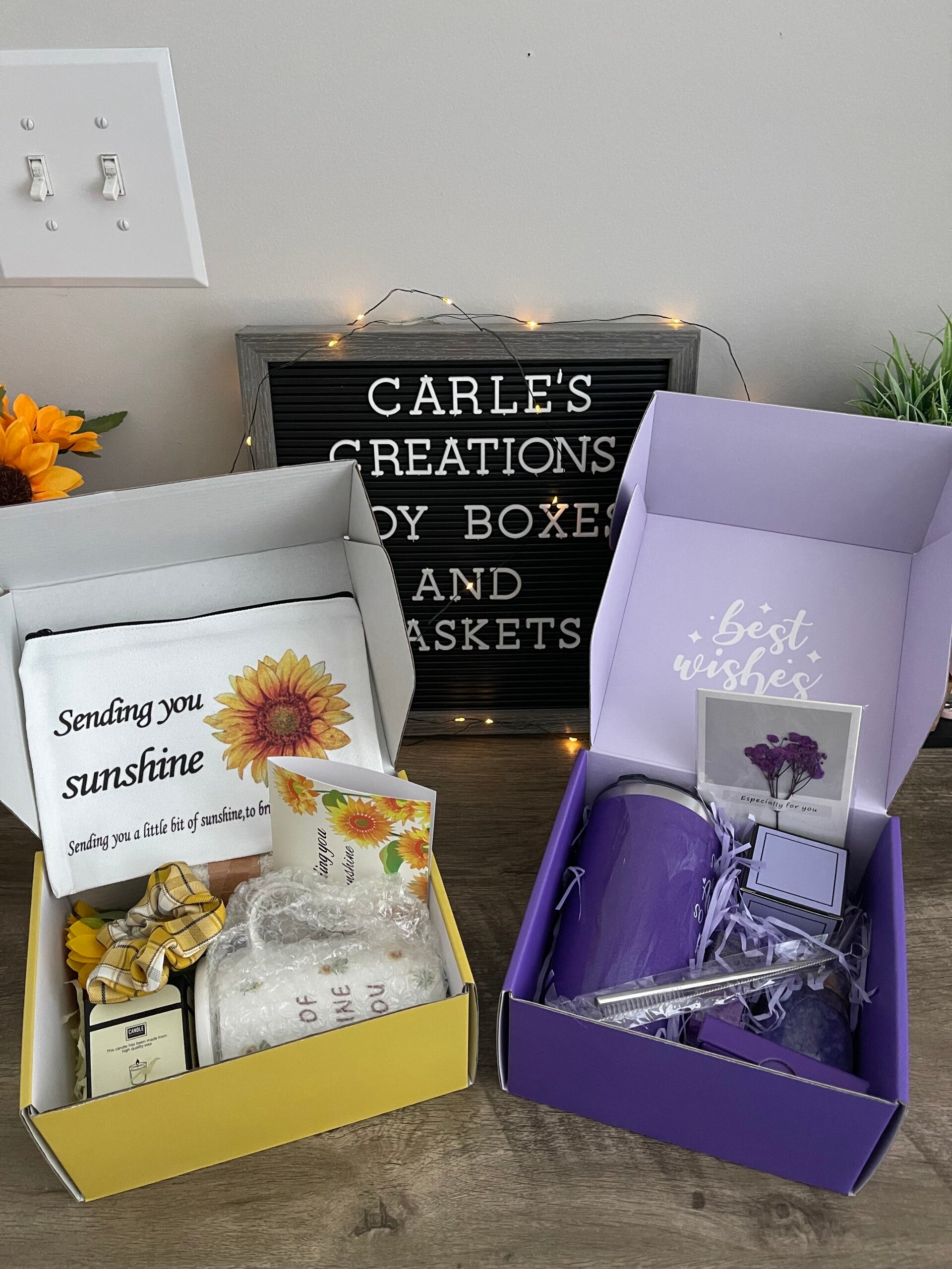 Joy Box comes with chosen items or pre made. Customer must request the size and the items that will be in the joy box and if they want a pre made box. If the box is needed before a specific date the order must be made 2 week prior to the specified date!